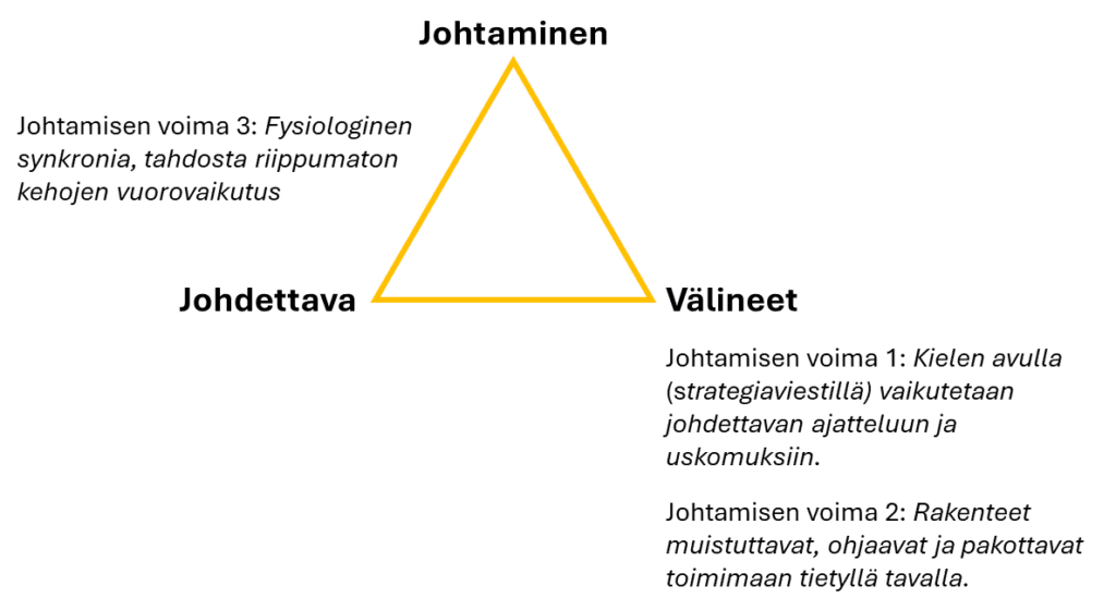 Johtamisessa on kolme voimaa, joilla johdettavaan vaikutetaan: väitelauseet (kieli), toiminnallinen ohjaus (rakenteet) ja kehollinen tahdistuminen (fysiologinen synkronia). Johtamisen ensimmäinen voima on kieli, jolla vaikutetaan johdettavan ajatteluun ja uskomuksiin. Kielellinen vaikuttaminen kiteytyy strategiaviestiin, jossa kerrotaan toimintaa ohjaavat arvot ja periaatteet eli mitä tavoitellaan ja miten sinne päästään. Kielen avulla johtaminen on välineellistä, koska kieli on kulttuurinen konstruktio ja siinä hyödynnetään erilaisia retorisia, joskus jopa manipulatiivisia keinoja. Näin ajateltuna myös niin sanottu suora puhe on lopulta aina epäsuoraa. Johtamispuhe pyrkii muuttamaan johdettavan uskomuksia työstä. Joskus lopputulosta nimitetään oppimiseksi.