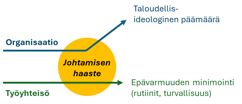 Organisaation johtamisen voi ajatella olevan asioiden tai toiminnan johtamista, joka kuitenkin on epäsuorasti aina ihmisten johtamista. Työyhteisön johtamisen voi sen sijaan nähdä välittömänä ihmisten kohtaamiseen perustuvana vaikuttamisena. Johtamisen haasteet syntyvät tilanteessa, kun organisaatio kääntyy taloudellis-ideologisen tavoitteensa suuntaan ja työyhteisö haluaa seurata tuttuja ja turvallisia epävarmuutta vähentäviä rutiinejaan kuten ennenkin.